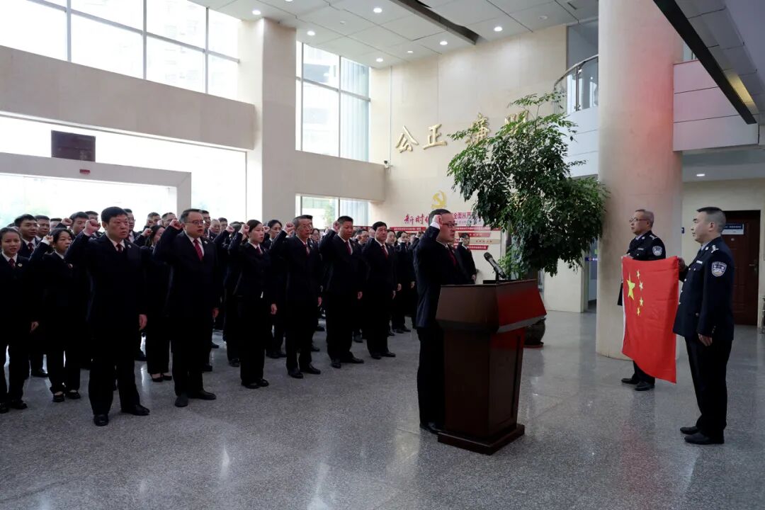 仪式在嘹亮的国歌声中拉开序幕,该院全体检察人员右手举拳,面向国旗庄严宣誓。“我宣誓:忠于中华人民共和国宪法,维护宪法权威,履行法定职责……”铿锵有力的誓言字字千钧、掷地有声,传递着耒阳检察对宪法的尊崇与对法治的坚守。